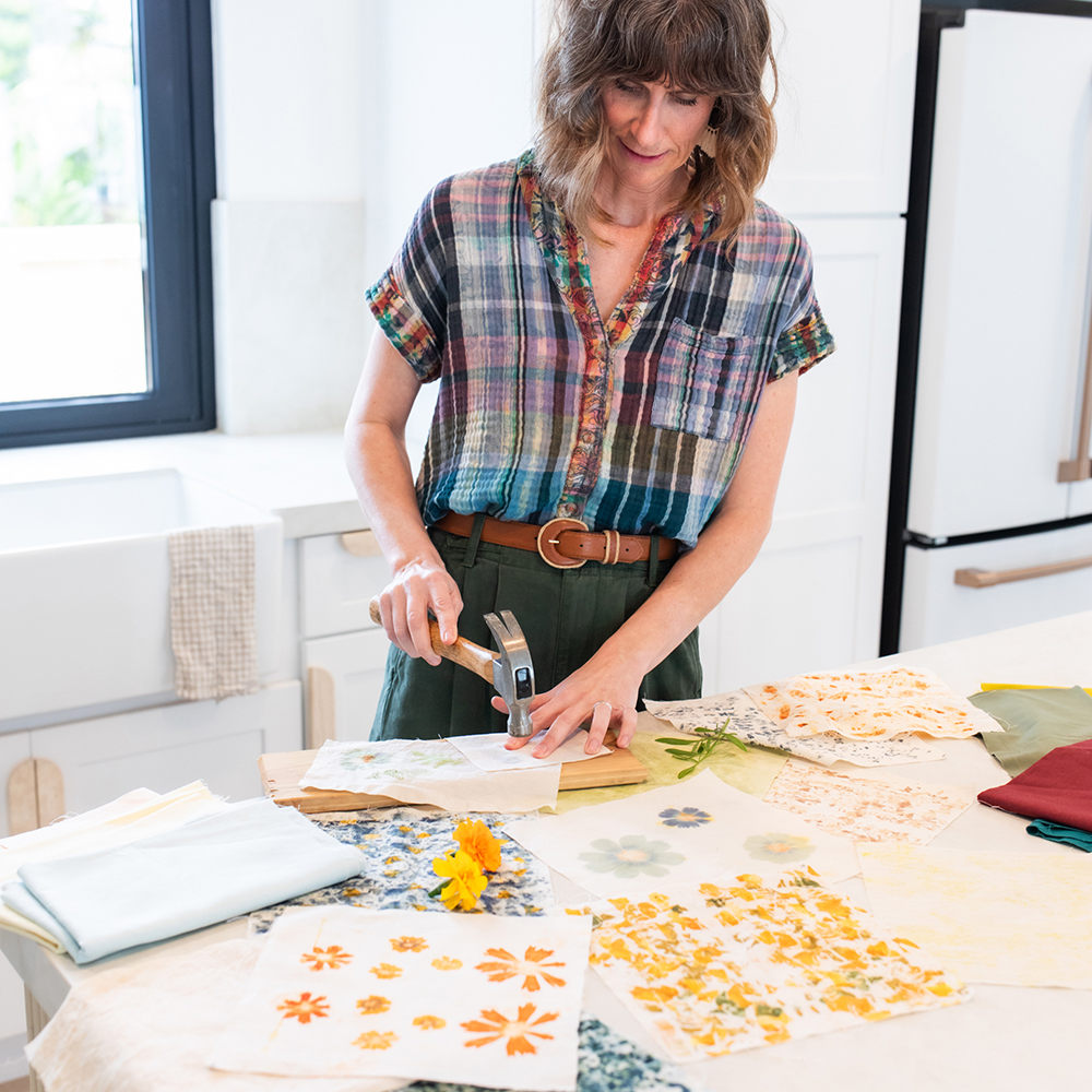 In this workshop video, students will learn the art of eco-printing—a botanical dyeing technique that uses leaves and blooms to create soft, organic patterns on fabric. Instructor Amanda Whited walks through two beginner-friendly methods: steam printing and hapazome hammer printing. Once the prints are set and revealed, students will focus on slow stitching to create boro-inspired trivets or coasters. Boro is a traditional Japanese mending style that uses layered textiles and visible hand stitching to create both beauty and utility. You’ll learn beginner friendly hand-stitching techniques to piece and embellish your coasters with your eco-printed fabrics.