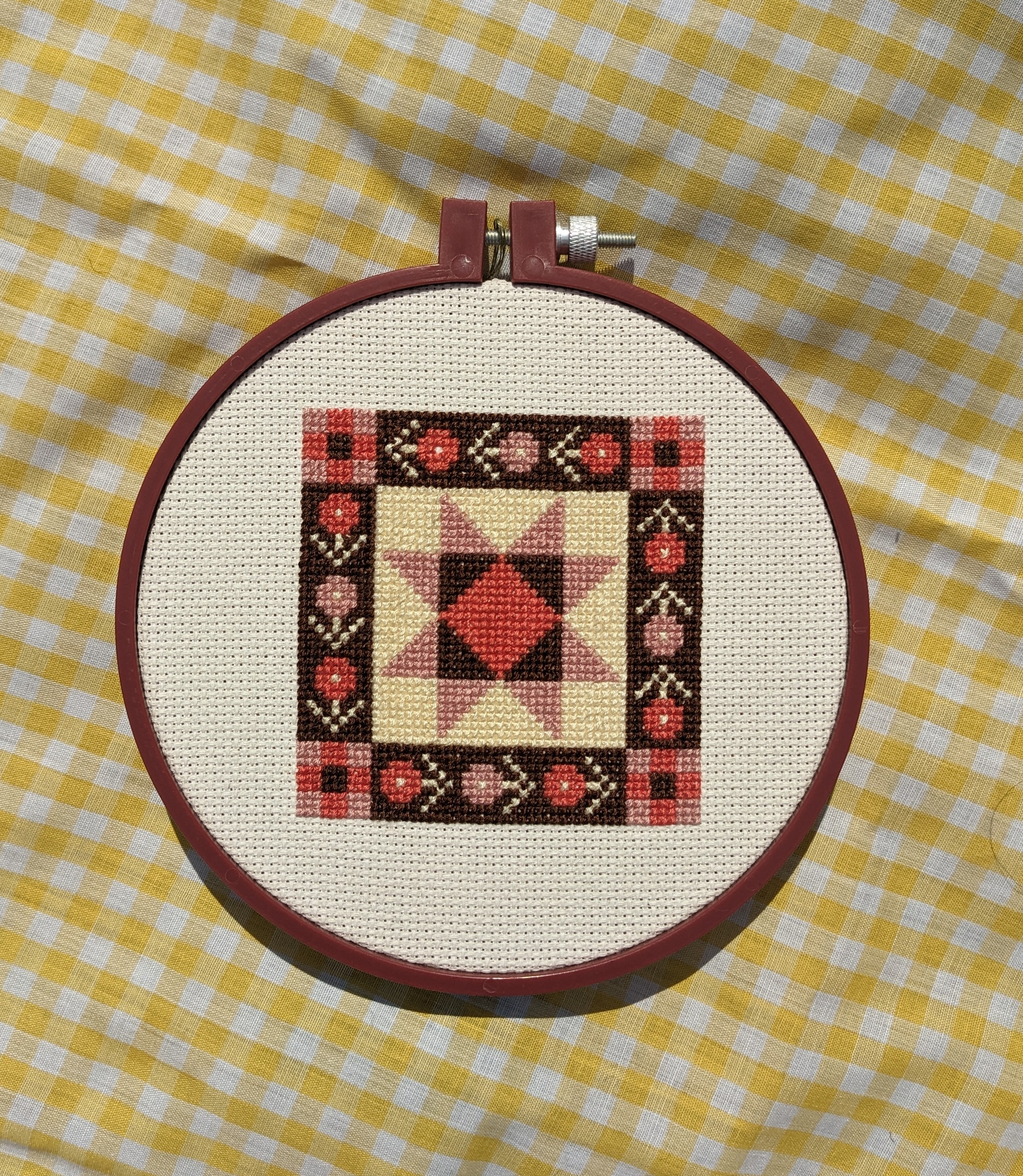 Designed by Michaela Coffield, this quilt-inspired cross stitch pattern features a bold central star block framed by a floral patchwork-style border. This design captures the charm of traditional quilts in a modern embroidery project. Perfect for both beginner and experienced stitchers, this pattern works beautifully as a wall hanging, gift, or addition to your home décor. It combines warm reds, pinks, browns, and creams for a cozy, heirloom feel. If you love quilt blocks but prefer needle and thread over a sewing machine, this pattern is an ideal project to enjoy slow stitching with a vintage touch. Cross stitch pattern is 3.5 x 3.5”.